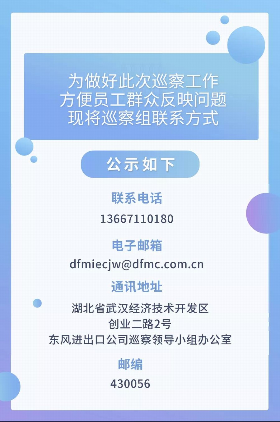 根據(jù)東風(fēng)進(jìn)出口公司黨委巡察工作計劃安排,將于今年7月對上海東風(fēng)汽車進(jìn)出口有限公司進(jìn)行巡察。屆時,將實現(xiàn)東風(fēng)進(jìn)出口公司黨委對直屬黨組織巡察全覆蓋。