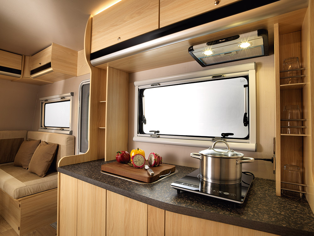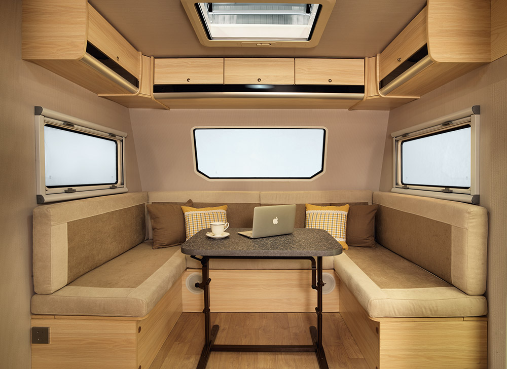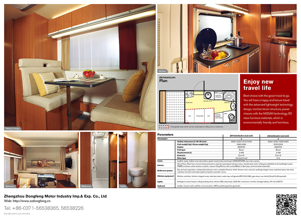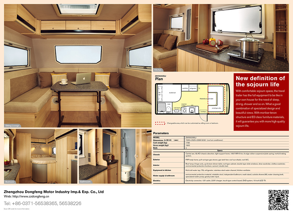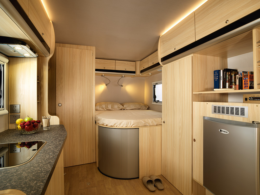 ??Sitting area for reading, for eating, sleeping, and entertainment.Operating area with cooker and basin, RV dedicated hood, special import RV 108Lfridge, extension of the special formula for outdoor gas cooker. Whole bathroomis equipped with electronically controlled toilet and black water tank pull-outplug, ventilation skylights. Shower area with a gas hot water systems, separateshower, ventilation skylights, imported shower system, waterproof bathroom. Wetand dry separation, isolation privacy original design.
